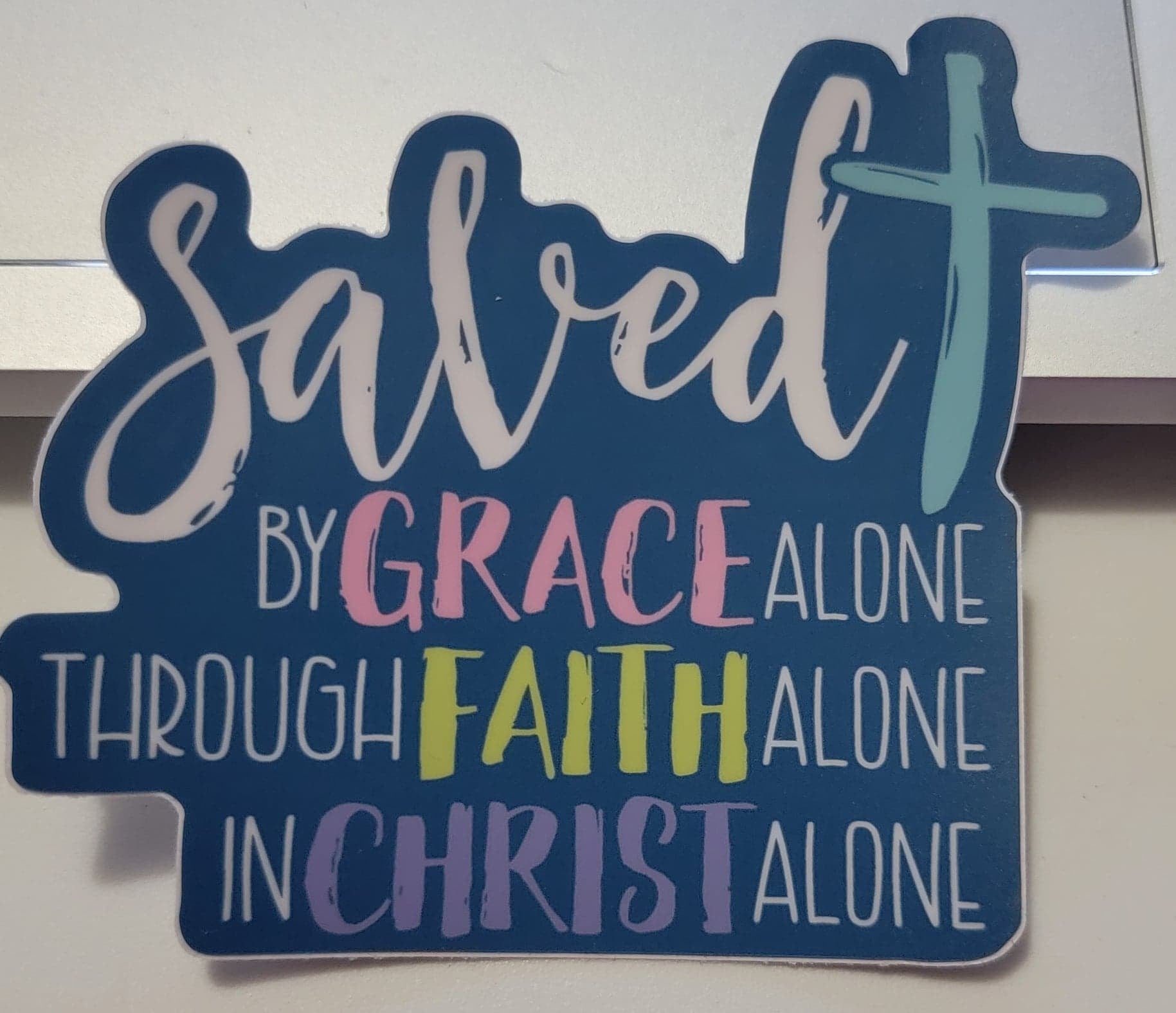 A quality vinyl sticker that's great to display your Faith on your computers, tablets, filing cabinets, refrigerators, and other cases with our Christian beliefs in one place. Saved by Grace alone through Faith alone in Christ alone. These stickers are fun to place on your computer, lockers, books, filing cabinets, etc.